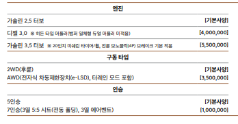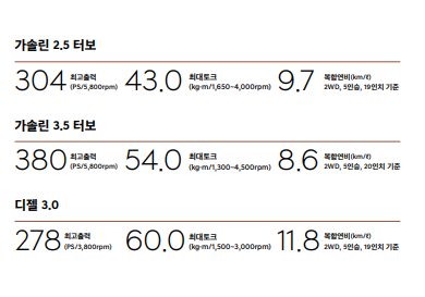 우선 3가지 종류로 출시가 되었습니다. 각 차종별로 비교해 보실 수 있는 표를 보고 말씀드릴게요. 엔진의 배기량에 따라 2.5, 3.0, 3.5로 나뉘는데 3.0은 디젤 모델로 출시되었습니다. 나머지는 가솔린 모델로 터보가 기본 장착입니다. 위의 표에는 없지만 5인승과 7인승 모델로 구분되고 타이어의 크기는 19인치부터 최대 22인치까지 장착이 가능하다고 합니다. 변속기는 모두 자동 8단으로 되어 있습니다.