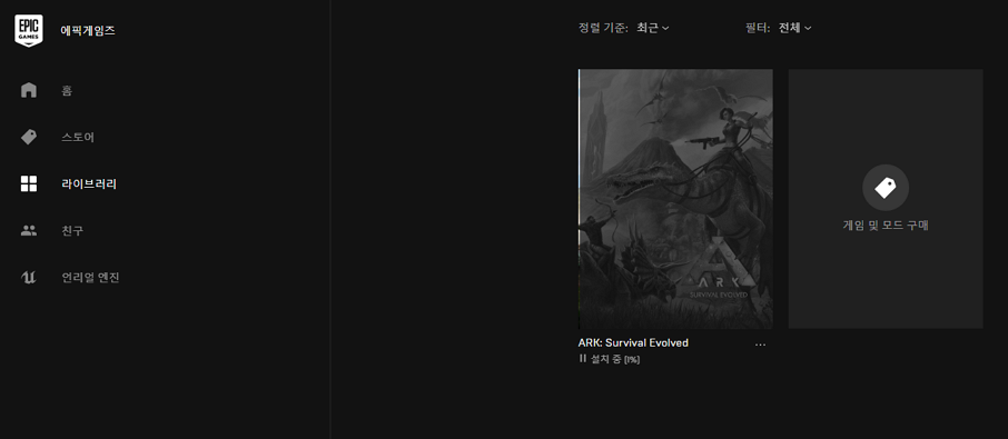 에픽 런처를 실행시킨 상태에서 왼쪽 중간에 보시면 라이브러리가 있는데 여기에 아크 서바이벌 이볼브드((ARK: Survival Evolved) 가 나타납니다. 이미지가 흑백으로 나타나는 건 아직 다운로드가 안되어 있다는 것이죠. 이미지 왼쪽 하단에 보시면 작은 글씨로 설치나 다운로드가 있을테니 누르시면 다운로드가 실행됩니다. 용량이 꽤 큰 게임이니 본인의 하드디스크(HDD)의 여유 용량을 꼭 확인하신 후 다운로드 받으시기 바랍니다