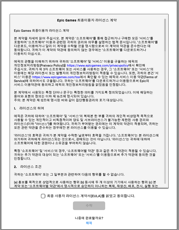 맨 처음 어떤 방식으로 에픽 계정에 로그인 할지 선택해야 합니다. 각자 원하는 방식으로 선택하시면 되구요. 전 구글을 통해 가입과 로그인을 해보겠습니다. 구글 계정 연결 후 라이선스 계약에 대한 내용이 나타나는데요.