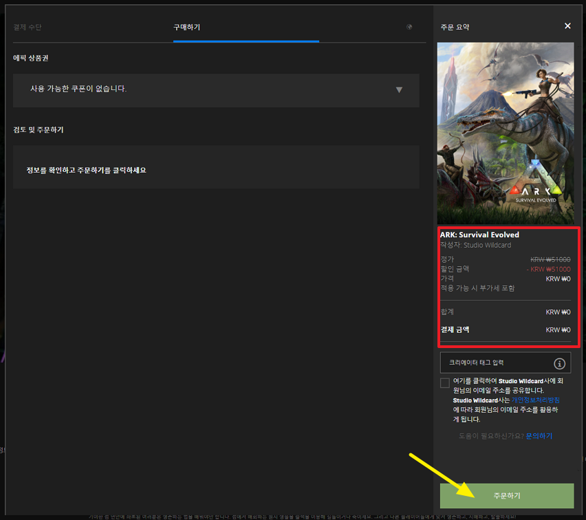 해당 게임에 들어가 보시면 가격이 0원이라게 확인이 될겁니다. 얼마전까지 51,000원에 판매했었군요. 꽤나 비싼게임에 속했었습니다. 금액을 확인 했으면 주문하기를 누릅니다.