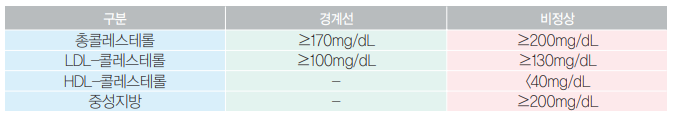 소아도 고지혈증이 생길 수 있는데 건강에는 당장 문제가 되지 않지만 성장해서 성인이 되면 심혈관과 관련된 질병이 생길 위험이 다른 사람보다 높아질 수 있으니 일반적인 수치와 차이가 많이 난다면 미리 대비하는게 더 좋겠죠. 수치는 아래표를 참고 하시면 되실 듯 합니다.
