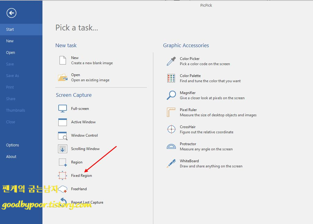 처음 실행시키면 나타나는 메인화면입니다. new 항목을 통해 여러 가지 정해진 캔버스도 지정할 수도 있고 본인이 원하는 사이즈로 지정할 수 있습니다. 그 외에도 컬러와 관련된 기능들이나 각종 액세서리 기능들이 보다 효율적인 이미지 캡쳐 작업을 하는데 도움을 줍니다. 제가 추천드리고 싶은 기능 중 하나는 바로 화살표로 표시한 Fixed Region 이라는 기능인데요.