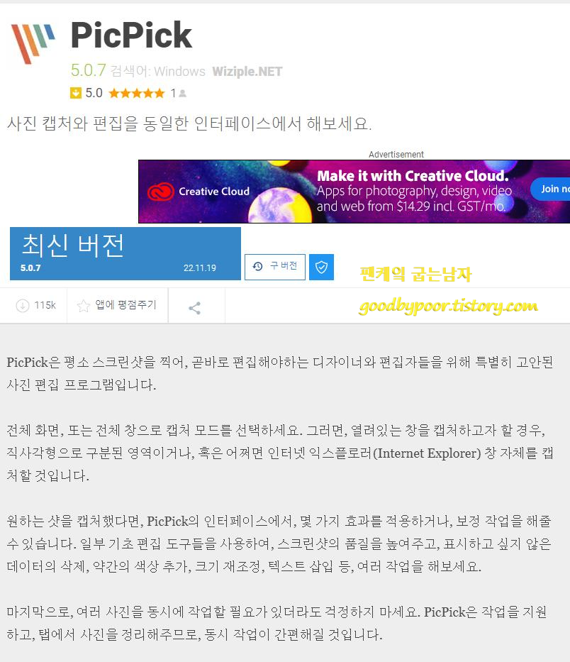 현재 픽픽(picpick)을 잘 사용하고 있는데 최근 업데이트 소식이 있더군요. 제가 사용하던 버전이 v5.0.7 이었는데 최근 업데이트가 된 버전은 v5.1.1 입니다. 추가된 기능은 듀얼모니터에서 발생했던 오류 수정과 업데이트를 알려주는 알림창이 닫히지 않는 부분이 수정되었다고 하는군요.