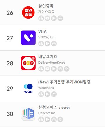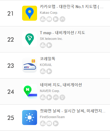 구글플레이 스토어에서 무료로 다운로드 받은 앱(어플) 순위21~25위는 카카오맵과 T map, 코레일톡, 네이버지도 네비게이션등 교통관련 어플들이 차지하고 있군요. 25위는 날씨와 미세먼지 관련 앱이 차지했군요. 30위까지는 할인중독, VITA, 많이들 사용하시는 배달어플 요기요등입니다. 우리은행 뱅킹서비스, 한컴오피스 뷰어(viewer)등이 포함되어 있습니다.