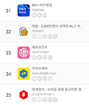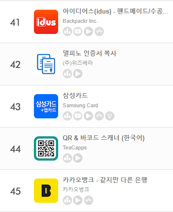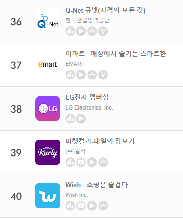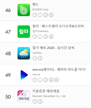 그외 밴드나 카카오뱅크, 직방, 일기예보, 키움증권, 위시(Wish), 마켓켈리, 자격증 정보 Q-net, 삼성카드, 윌라, 번개장터등 다양한 어플과 앱들이 구글플레이 스토어 다운로드 50위권에 포함되어 있군요. 해당 자료는 무료로 사용할 수 있는 앱을 기준으로 작성된 순위라는 점 알아주시기 바랍니다. 나중에 유료관련 어플순위도 한번 작성해 보도록 하겠습니다.