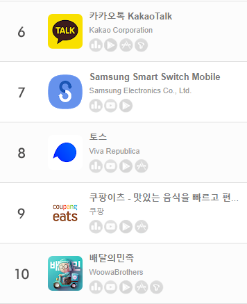 무료 어플(앱) 5위는 국민 메신져라 할 수 있는 카카오톡입니다. 흔히 우리나라 어플이라고 생각하기 쉽지만 실질적인 주주는 중국이라는 사실 잘 알아두시기 바랍니다. 얼른 국내 자본이 다가져와야 할텐데 안타깝네요. 앱순위 7위는 삼성 스마트 스위치 모바일이 차지했군요. 역시 삼성 갤럭시 스마트폰을 많이들 사용하시기 때문인 것 같습니다.
