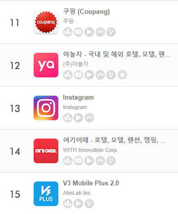 11위는 쿠팡 앱(어플)입니다. PC에서 웹사이트를 이용하시는 분들이 많은데 이렇게 스마트폰 앱으로도 많이들 사용하시는군요. 상위권에 쿠팡이 2가지나 있군요. 구글프레이스토어 무료 다운로드 12위는 각종 숙박시설을 이용할 수 있는 야놀자 입니다. 뭐 신동엽씨가 나와서 TV광고도 빵빵 때리던데 10위권 안에는 진입 못했군요. 13위는 SNS앱 인스타그램입니다. 무료어플 14위는 야놀자와 비슷한 여기어때 어플이 차지했습니다. 15위는 보안을 위한 앱(어플)인 V3 백신관련 앱입니다.