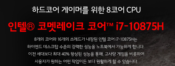 하드코어 게이밍 노트북이라는 별칭에 걸맞게 총 8개의 코어로 구성된 인텔의 최근 CPU인 코멧레이크 코어 i7-1087H 를 탑재하고 있어 속도면에서 어떤 노트북과도 비교가 되지 않습니다. CPU 명칭 뒤에 H 가 붙은건 고사양 CPU라는 사실 잘 아시죠? 클럭의 경우 2.3GHz 로 최대 5.1GHz 까지 성능을 끌어 올릴 수 있으니 꼭 알아두시구요. 코멧레이크의 경우 이전 세대의 cpu보다 성능 향상이 40% 가량 높아졌다고 하니 구매후 한번 비교해 보시기 바랍니다.
