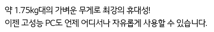 사운드의 경우 "DTS:X 울트라" 라는 기술이 적용되어 음악이나 영화감상 또는 간단한 게임등을 할때 입체적인 사운드를 즐기시에 충분한 사운드를 들려준다고 하는군요. 이런 여러가지 사무환경, 업무환경에 적합한 15.6인치 고성능 노트북임에도 19.9mm 의 슬림디자인이 채택되었고 무게도 1.75kg 으로 직장인이나 학생들이 휴대하고 다니기에 큰 무리가 없이 장소에 구애받지 않고 사용하기 좋습니다.