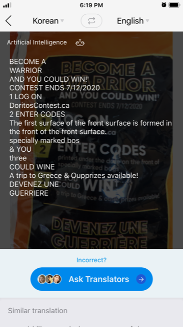 첫 화면에서 카메라 아이콘을 클릭하고 사진을 찍으면 밑의 처럼 이미지에서 언어를 인식해줍니다. 오호! 위에 Artificial Intelligence 라고 로봇 아이콘도 나타나는데, 일부 틀린 부분들도 있지만 거의 비슷하게 인식을 했습니다. 여행 중의 표지판이나 안내문 인식하는데 꼭 필요한 기능이겠네요.