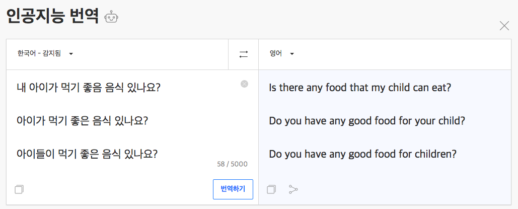 그런데 영문으로 번역된 내용을 보면 조금씩 내용이 틀리죠? 한국어의 특징 중에 주어를 생략하거나 주어의 대상을 모호하게 표현하는 부분이 있는데요, 영어는 반대로 주어를 무척 명확히 표현하는 언어라고 생각합니다. 그래서 제가 생각하기에는 번역하기 전에 한국어의 주어를 명확히 적어주는 것이 영어의 번역의 오류를 줄이는 하나의 방법이 될 수 있지 않을까 생각되네요.
