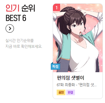 요즘 SBS에서 방영하는 드라마 편의점 샛별이 혹시 보시나요? 김유정과 지창욱이 나와서 인기를 끌고 있는 드라마인데 원작만화가 여기서 무지하게 인기를 끌고 있는듯 하더군요. 독점인걸 보니 탑툰에서만 볼 수 있는 것 같은데 역시 인기만화 원작은 드라마로 종종 만들어 지는 경우가 많군요. 아무튼 어른이들이 좋아하는 작품들도 많고 다양한 무료, 할인 서비스도 많이하고 있으니 사이트에 한번 들려서 쭈~욱 훝어보시면 요즘 어떤 웹툰이 인기가 많은지 아실 수 있을 겁니다.