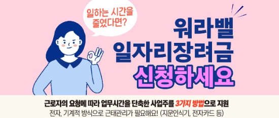본인의 건강상 문제나 은퇴준비, 학업등을 위한 교육시간의 필요 또는 돌봐야 할 가족으로 인해...등등 다양한 이유가 있을 수 있을 겁니다. 이런 경우 근로시간 단축과 관련된 지원을 허용한 사업주의 경우 근로시간 단축제도를 도입하면 워라밸 일자리 장려금을 지원받게 됩니다.