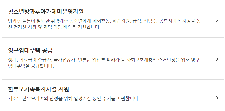- 기본생활 지원제도 : 무주택 저소득 모, 부자가족을 대상으로 지원이 됩니다.(기본적으로 3년이며 2년간 더 연장 가능)