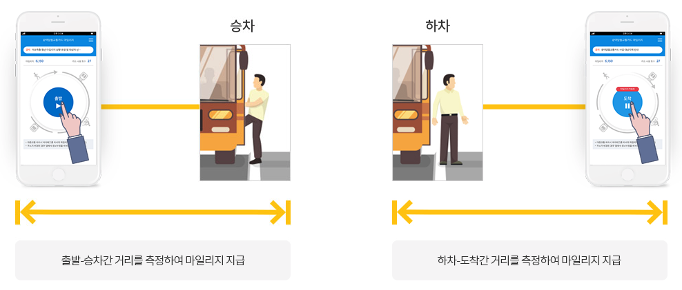 집(사무실) 출발(앱 출발 버튼 클릭) -> 대중교통 출발 -> 대중교통 도착 -> 목적지 도착(앱 도착 버튼 클릭)