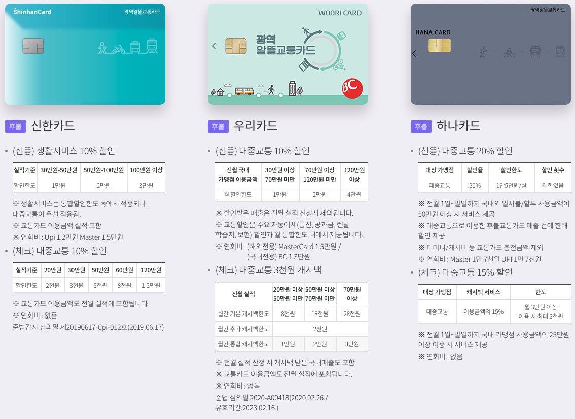 알뜰광역 교통카드에는 신용·체크카드 있고, 회사로는 신한카드, 우리카드, 하나카드 있습니다. 밑에 있는 카드들의 내용을 확인하고 광역알뜰교통카드를 신청하세요.