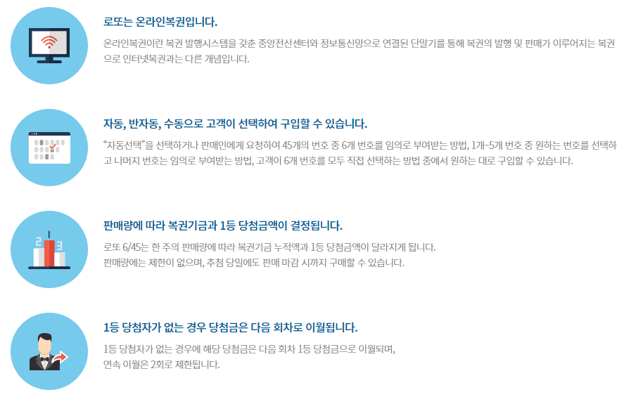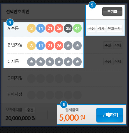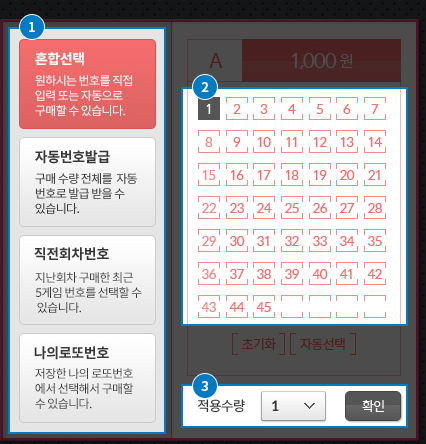 방식은 매장에서 구매하는 방식과 비슷합니다. 단지 인터넷 사이트를 통해서 한다는 것만 다르다고 할 수 있을 정도죠. 선택방식을 정하시고 번호 고르시고 수량체크 하신 후 수동, 자동, 반자동 고르신 후 구매하기 버튼 딱~그림만 봐도 쉽게 이해하실 수 있죠. 간단하니까 직접 한번만 해보시면 쉽게 인터넷으로 복권을 구매하는 방법을 아실겁니다.