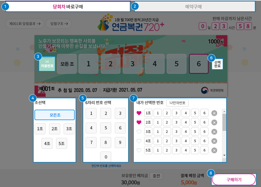 이번엔 연급복권도 어떻게 구매하는지 간단히 알아보겠습니다. 당회차를 바로 구매하실지 예약구매 하실지 정하시고 자동번호를 선택하신 후 원하는 조를 선택, 6자리 번호를 고르시고 구매하기를 누르시면 인터넷으로 연금복권 구매가 완료 됩니다.