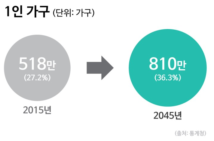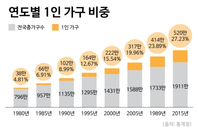 이건 단순한 문제가 아니라고 생각됩니다. 1인가구는 노년층에도 속하는 문제이고 젊은층에도 속하는 문제라 하나의 사회문제라 인식하고 접근하는게 맞을듯 싶은데요. 현재 우리나라는 1인가구의 비중이 급격하게 늘어나고 있는 국가 중 하나라 할 수 있습니다.