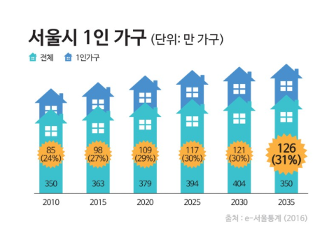 최근 가족의 형태가 구성원이 줄어드는 이유도 있겠지만 부모님을 모시는 함께사는 문화가 적어지면서 노년층도 사별등의 이유로 쉽게 1인가구가 될 수 있고 젊은층의 경우 취업이나 늦은 결혼등으로 인해 독립이 늦어지는등의 이유로 쉽게 1인가구로 생활하게 되는 경우가 생깁니다. 중년층의 경우에도 결혼을 기피하는 인식과 맞벌이 또는 기러기 부부등 다양한 경우들이 있을 수 있습니다. 이렇게 구성된 1인 가구가 현재 30%에 육박한다고 하니 모두가 관심을 가져야 할 문제가 아닐까 싶은데요.