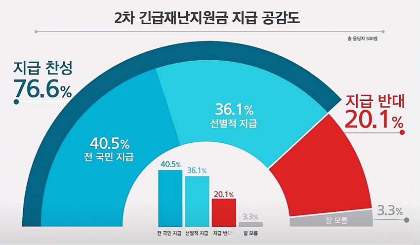 우선 2차 재난지원금 지급에 대한 찬성여론은 76%가 넘게 찬성을 하는 입장이라 밝혔고 지급을 반대하는 입장은 20% 가량, 잘 모르겠다는 입장은 3% 가량밖에 안나왔다고 하는군요.