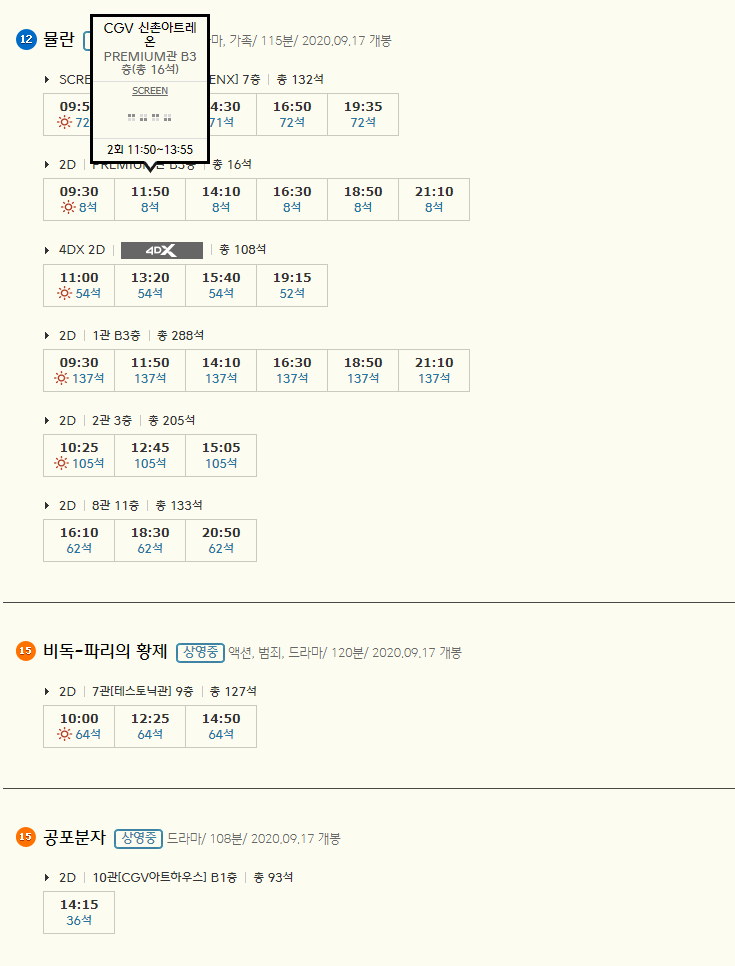 신촌 CGV 아트레온의 21일 상영시간표를 보면 영화가 더 많이 늘어난 걸 보실 수 있는데요. 오!문희가 새로 시작되는군요. 그 외에도 다양한 상영작들이 있습니다. 역시나 개봉관 숫자나 상영시간을 보면 뮬란을 밀어준다는 것이 눈에 훤히 보이는군요. 쩝...