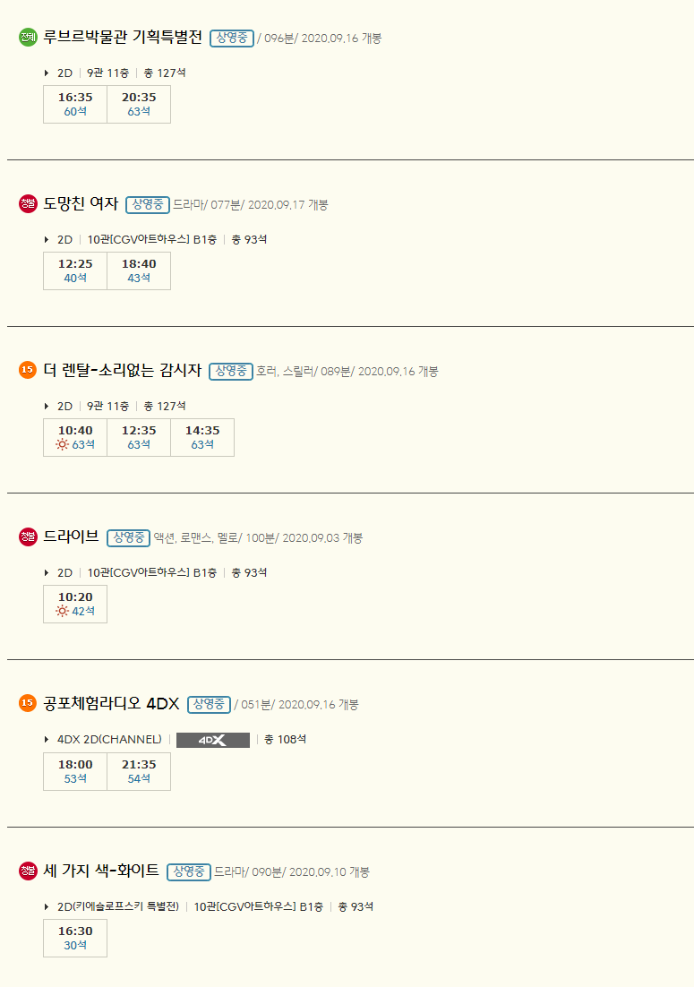 테넷 / 뮬란 / 루브르박물관 기획특별전 / 드라이브 / 공포체엄라디오 4DX / 아임낫데이 / 오! 문희 / 비독-파리의 황제 / 공포분자 / 더렌탈-소리없는 감시자 / 세가지 색-화이트 / 테스와 보낸 여름 / 남극 탐험가는 나를 좋아해 / 트루스 / 캐롤 / 도망친 여자 / 테칼로그 7, 8 등 다양한 영화들이 상영중에 있습니다.