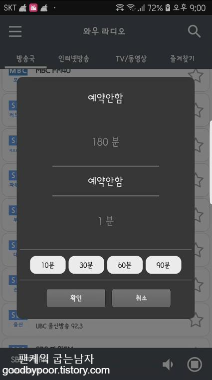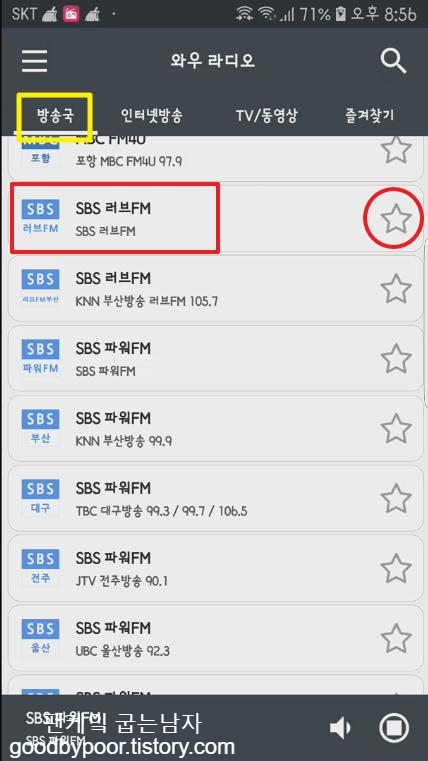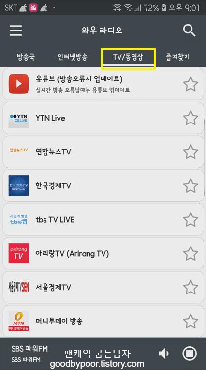 모두 완료된 후 메뉴를 한번 살펴보면 방송국 / 인터넷 방송 / TV 동영상 / 즐겨찾기 등이 있습니다. 방송국을 눌러서 아래로 스코롤 해서 보시면 FM 방송국 중 각 지방 kbs, mbc, sbs, ebs, 아리랑, tbs, tbn, febc, bbs, btn, cpbc, ifm, afn 등 정말 다양한 라디오 방송들이 나옵니다. 테스트 삼아 sbs러브 fm을 눌러서 방송을 들어보니 선명하게 잘 나오더군요. 오른쪽의 별 표시를 체크하면 즐겨찾기에 따로 저장해 놓을 수 있으니 평소 자주 듣는 방송채널이 있다면 별 모양을 누르셔서 저장해 놓으면 편하더군요.
