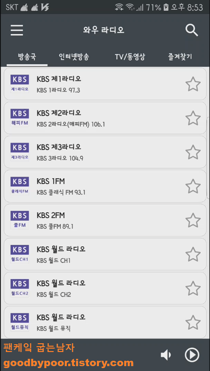 그래도 혹시나 여전히 라디오를 즐겨 들으시거나 듣기에 마땅한 음악을 찾기 힘드신 분들을 위해 무료로 쓸만한 라디오앱(어플)을 하나 추천해 드리고자 합니다. 여러 가지 다양한 프로그램을 무료로 즐길 수 있으니 읽어보시고 맘에 들면 한번 설치해서 사용해 보시길 바랍니다. fm이나 인터넷 방송, tv 동영상 등 다양한 주파수에 각 지방 mbc, kbs, 증권 방송, cbs, tbs 등등 여러 채널을 들으실 수 있습니다.