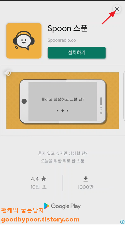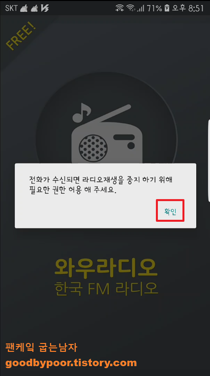 라디오 앱을 실행시키면 여러 가지 권한에 대한 허용 여부를 물어보는 창이 뜹니다. 재생되는 동안 혹 전화가 오면 자동으로 재생을 중지해 주는 기능이나 각 전화 권한 등을 물어보는 것들이니까 확인을 그냥 누르시면 됩니다. 아무래도 무료 앱이다 보니 중간에 광고가 나오는군요. 스푼 광고가 나오는데 그냥 위에 X 버튼을 살포시 눌러 주시면 됩니다.