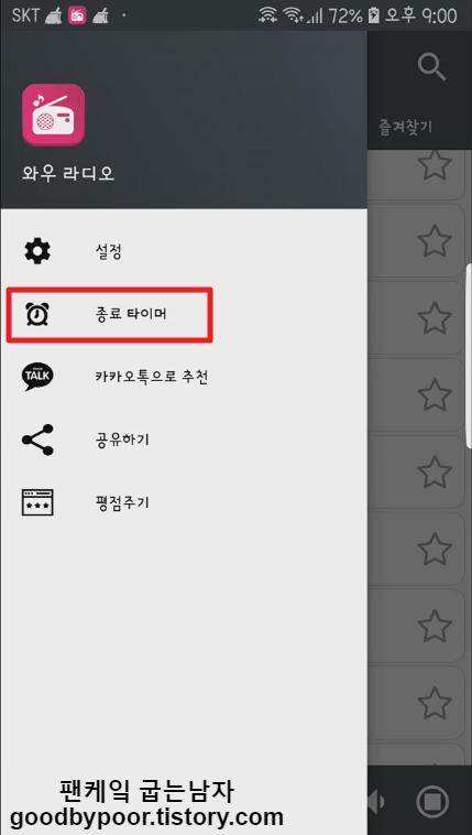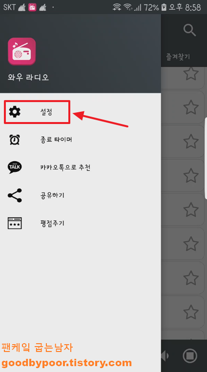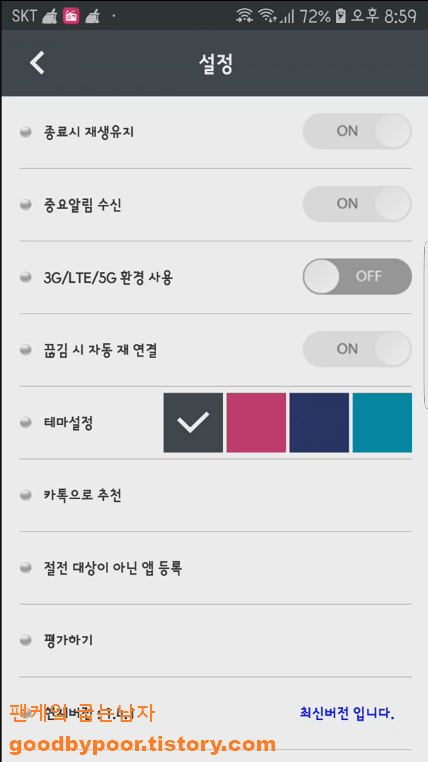 좌측 상단의 세줄 모양을 누르시면 와우 라디오의 다양한 기능들이 나오는데요. 그중 설정에 들어가 보시면 종료를 해도 재생을 유지하는 기능을 끄고 켤 수 있는 기능, 중요한 알람, 와이파이와 데이터 등에 따른 실행 여부, 테마, 카톡 추천 등 필요한 설정으로 지정할 수 있습니다. 3번째에 있는 데이터 사용은 꼭 꺼두시는 것이 좋겠군요. 무제한 데이터를 쓰시면 상관없겠지만 와이파이에서만 쓰시려면 꼭 끄셔야 합니다. 종료 시 재생유지 기능이 있다는 게 참 맘에 듭니다.