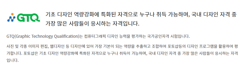 등록번호 : 2008-0192 공인번호 : 산업통상자원부 2019-GTQ 그래픽기술자격 1급 / 2급 자격증 종류 : 공인민간자격 3급도 있는데 따로 등록이 되어 있습니다. 국가에서 인증하는 공인자격이 아닙니다. 3급은 공인번호는 없고 등록민간자격증에 해당하며 한국어도비시스템즈와 한글과 컴퓨터에서 협찬. |