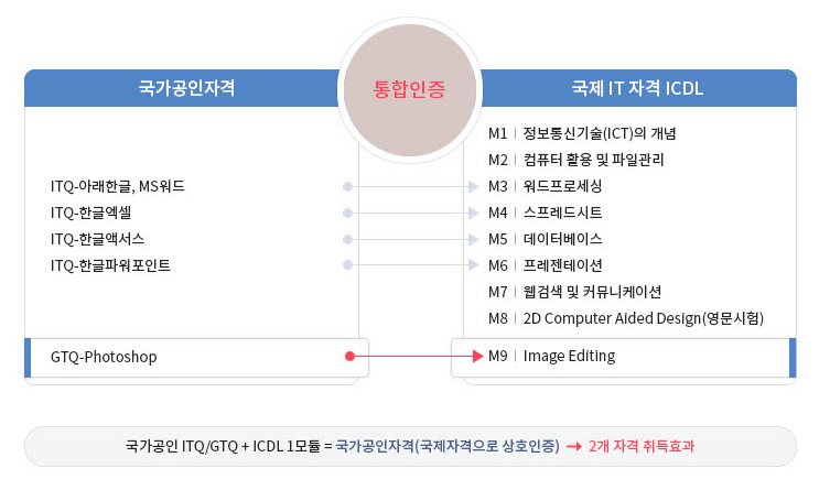 국가공인 GTQ나 ITQ 자격증과 함께 ICDL 자격 1개를 더 취득하면 2개 자격증을 취득한 효과가 있으면서 국제자격으로 인증이 되어서 50개 나라에서 그래픽 자격을 인정 받을 수 있습니다.