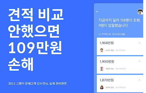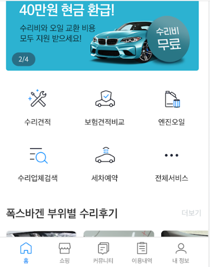일단 힘들게 일일이 견적 발품을 팔 필요없이 간단하게 비교견적을 해볼 수 있다는 장점을 잘 활용하시면 괜한 중고차 수리 바가지를 쓰지 않을 수 있어 추천 드리는 어플입니다. 그리고 픽업서비스등으로 내차를 수리하기 위해 가져가기전에 꼭 전화등으로 최종 견적이 맞는지 확인도 해보시기 바랄께요.