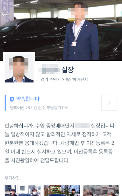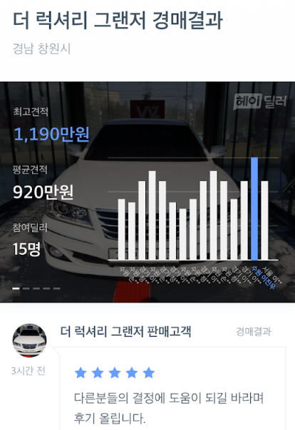 헤이딜러의 장점 역시 위의 카닥처럼 스마트폰으로 간단하게 가격비교를 해볼 수 있다는 건데요. 간단한 중고차 등록만으로 내차를 어느정도로 팔 수 있는지 많은 견적을 받아서 비교해 볼 수 있습니다. 실제로 거래가 이뤄지면 2~3일안에 명의이전도 가능하다는 점이 맘에 들더군요. 거기에 부당한 감가도 없는 편이라 처음 내차를 중고차로 팔고자 한다면 알아두면 여러면에서 유용하게 활용할 수 있는 어플이라 생각되는군요.