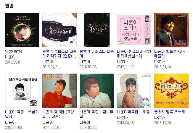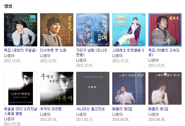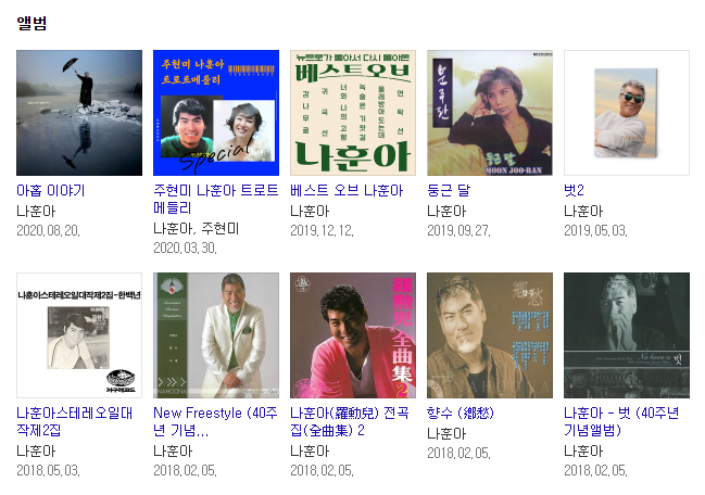 가장 최근에 발표된 신곡이 포함된 나훈아의 아홉 이야기 앨범은 얼마전 방송이후 많은 분들이 들어보셨을거라 생각됩니다. 그 외 다양한 노래를 감상하고 싶으신 분들은 앨범 제목이나 노래 제목을 잘 기억하셨다가 유튜브에 검색해 보시면 거의 대부분 들어보실 수 있을 실 겁니다. 무료로 듣기가 되니까 나훈아씨의 팬들이라면 꼭 들어보시기 바랄께요. 주현미와 부른 트로트 메들리도 보이고 40주년 기념앨범도 보이는군요.