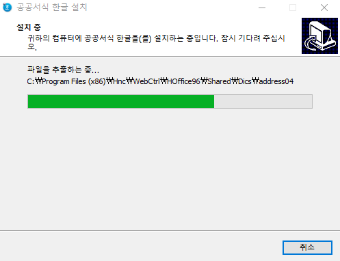 설치과정이 보이면서 공공서식 한글 프로그램의 모든 설치가 완료되었다고 나오면 종료 버튼을 누르시면 모든 과정이 마무리 됩니다.