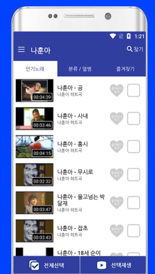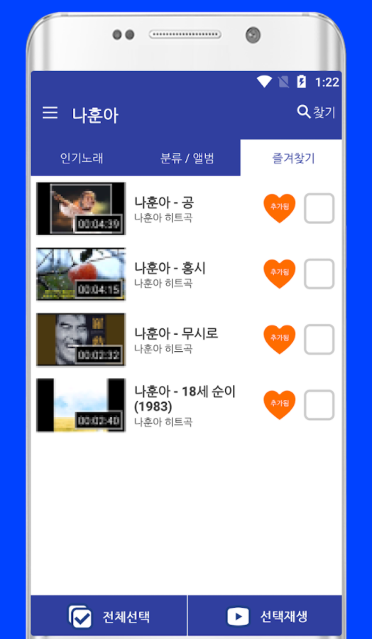 영상이 있는 노래들은 나훈아의 영상과 함께 플레이 되며 노래 옆 별 모양을 선택해 놓으시면 자동으로 즐겨찾기에 등록이 되니 다시 찾아볼 필요없이 즐겨찾기에서 바로 내가 좋아해서 선곡한 나훈아 노래모음이나 신곡을 바로 감상하실 수 있는 편리한 기능입니다.