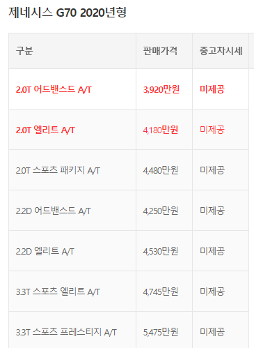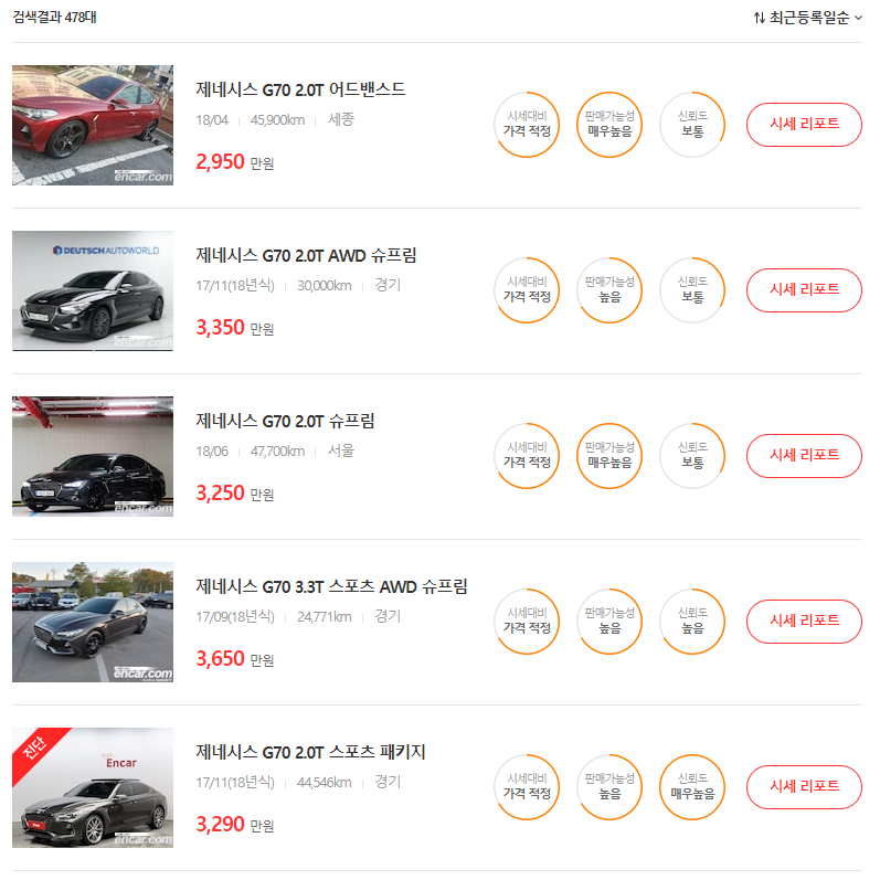 이 3가지만 잘 비교해보면 엔카 sk중고차에서 얻을 수 있는 정보는 다 얻은게 아닐까 하는 생각이 드는군요. 물론 다른 중요한 정보도 필히 확인해 봐야 하겠지만 말이죠. 우선 요즘 핫한 관심을 받고 있는 제네시스 G70 중고차 시세표를 한번 예로 살펴봤습니다.