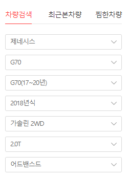 내가 검색한 엔카 sk중고차의 차량검색 조건에 맞는 차량이 없다면 메뉴를 조금씩 바꿔가면서 선택하시면 원하는 차량을 찾아보실 있을텐데요. 물론 세부항목을 일일이 선택하는게 번거롭다면 상위 큰 항목만 선택하시는 것도 방법입니다. 제네시스 선택 후 G70 선택만 하셔도 원하는 차량의 시세표를 보실 수 있는거죠.