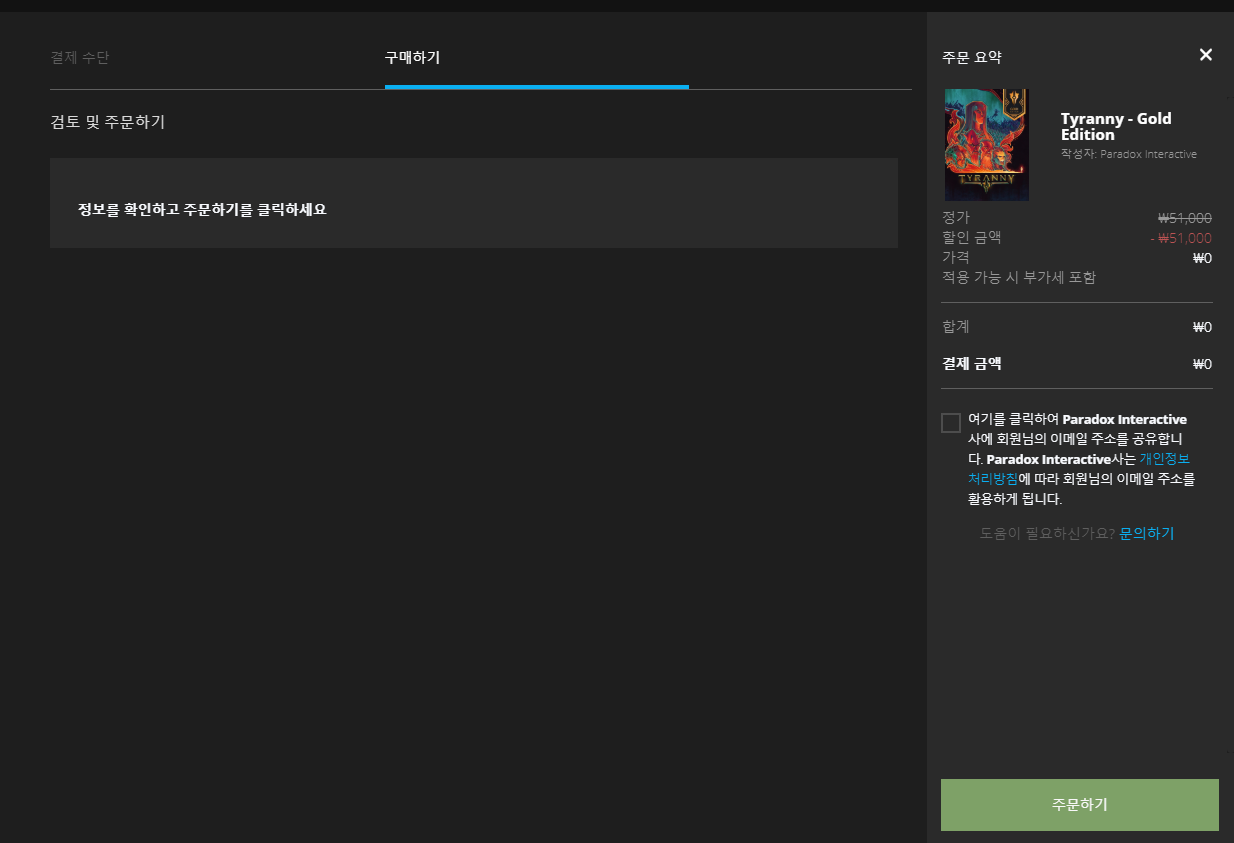 티러니 받기를 하시면 주문하기 화면으로 넘어가는데요. 가격을 보시면 0원으로 표시되는 걸 보실 수 있을 겁니다. 그럼 주저없이 주문하기를 누르시면 다운로드와 함께 내 에픽게임즈 런처의 라이브러리에 담기게 되서 언제든지 플레이하실 수 있습니다.