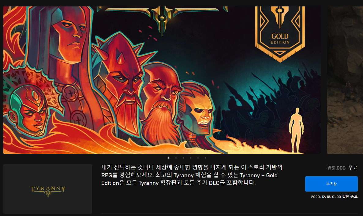 두번째 에픽게임즈 무료 pc 다운로드 게임인 티러니입니다. 역시나 위에 소개해드린 게임과 비슷한 장르인 어드밴쳐 액션 RPG 장르의 게임인데요. 그래픽도 수려하고 역시나 좋은 평을 많이 받은 게임중 하나라 할 수 있을듯 합니다. 역시나 다운로드 받는 기간은 12월18일까지로 이 기간동안 받아놓으시면 평생 게임을 즐기실 수 있죠. 전 이미 티러니를 다운로드 받았기 때문에 에픽게임즈 런처에 저렇게 보유함이라고 표시되는데 아직 다운로드 전이라면 받기로 표시됩니다.