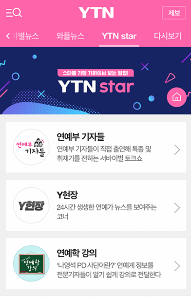와플뉴스라는 코너도 있으니 일반 티비에서 보는 뉴스뿐 아니라 잘 알려지지 않은 소식도 보실 수 있구요. ytn star를 통해 연예계 관련 소식이나 뉴스도 어플을 통해 보실 수 있습니다.