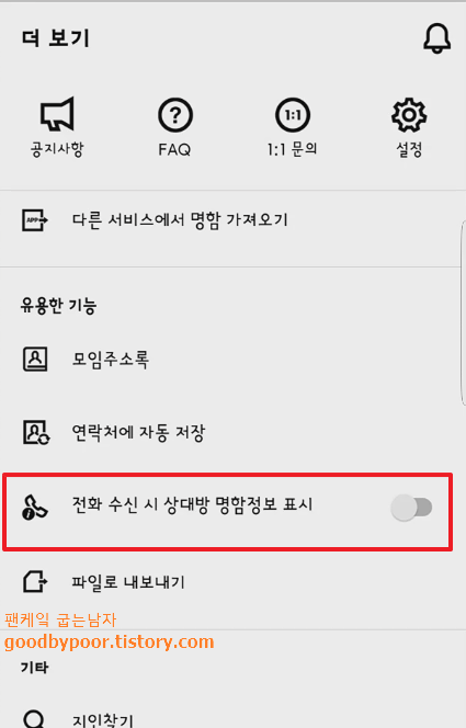 메인화면의 우측 하단 더보기를 클릭해 보시면 알림에 대한 설정들이 있는데 발신자의 명함정보 표시 기능이라는 것이 있습니다. 어떤 기능이냐면 저장한 명함의 당사자가 전화를 걸어오면 내 스마트폰에 해당 명함이 뜨면서 어떤 사람이었는지 쉽게 기억할 수 있게 도와줍니다. 신박하죠? 꼭 설정하셔서 활용해 보시기 바랍니다.