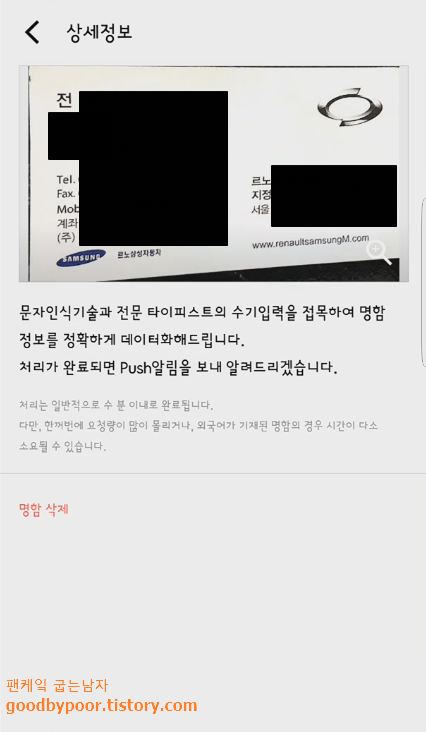 문자인식 기술, 전문 타이피스트 등의 수기입력을 접목해서 명함에 있는 정보를 정확한 데이터베이스화 시켜준다... 왠지 그럴듯한 신기술이란 생각이 드는군요. 그리고 처리가 마루리 되면 push 알람을 통해 알려준다고 하니 일단 기다려 봤습니다. 잠시 후 알람 소리와 함께 마무리되었다고 하더군요.