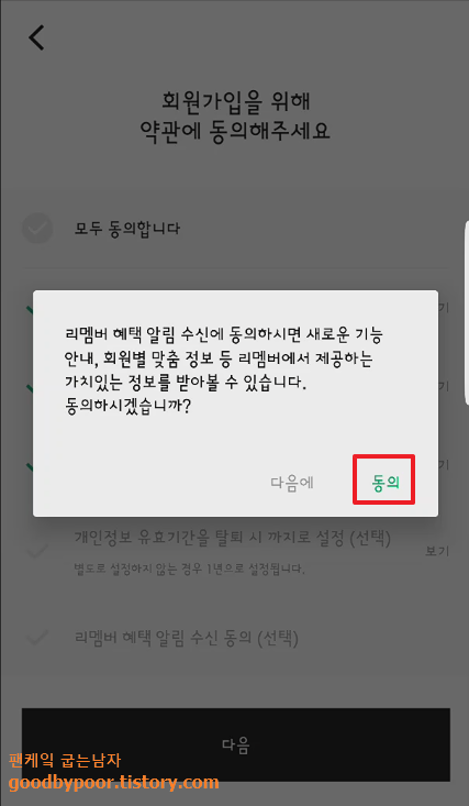 각종 정보에 대한 소식을 알고 싶으시다면 동의를 누르시고 원하지 않으시면 다음에를 눌러 주시면 됩니다. 그럼 어떤 방식으로 가입할지에 대한 창이 뜨는데 전 네이버를 통해서 가입하도록 하겠습니다. 각자 편한 방식대로 하시면 될 것 같군요.