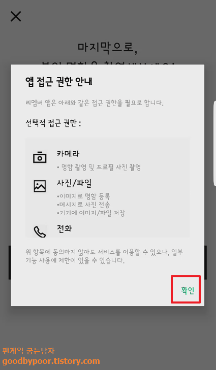 앱의 접근 권한에 대한 안내가 나타나면 확인을 누르세요. 그럼 우측과 같은 화면이 뜨면서 녹색 네모난 상자가 열심히 명함을 인식하기 위해 움직이다가 저렇게 명함 크기에 딱 맞게 위치하게 되는데 그때 동그란 촬영 버튼을 누르시면 됩니다. 마치 미션 임파서블을 찍는듯한 착각이...ㅎㅎㅎ