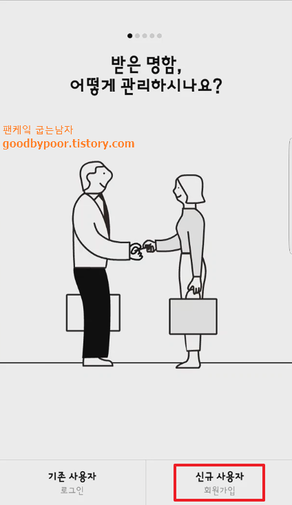 받은 명함 어떻게 관리하시나요? 라는 질문과 함께 기존 사용자와 신규 사용자에 대한 시작 버튼이 화면 하단에 나타나게 되는데요. 처음 사용하는지라 신규 사용자로 가입을 하겠습니다. 필수항목만 선택하시고 다음 버튼을 누르시면 됩니다.