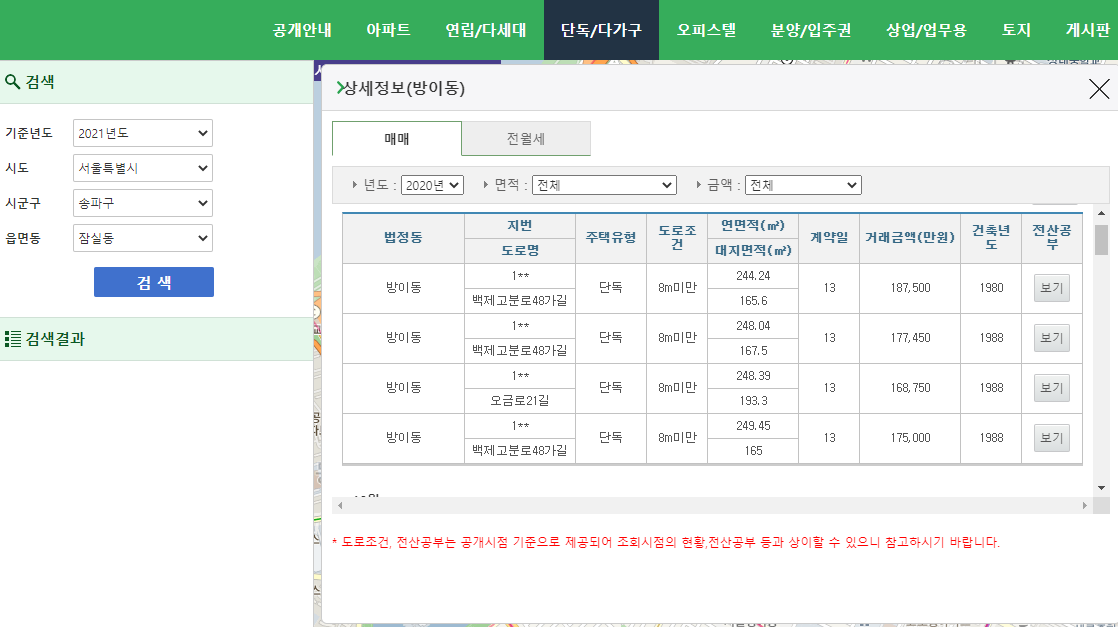 예시로 송파구 방이동과 강남구 신사동의 단독주택과 아파트를 한번 찾아봤는데요. 역시 비싸면서 부동산 가격이 많이오른 지역이라 그런지 상당히 비싸다는 걸 알 수 있었습니다. 역시 서울 집값은 상상을 초월하는군요. 하긴 최근엔 지방 대도시들도 상당히 실거래가가 비싸니 내가 원하는 지역에 원하는 집을 찾는다는게 결코 쉬운일은 아닌듯 하군요.