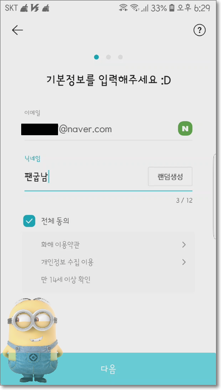기본정보를 작성해야 하더군요. 전 제 닉네임 팬케잌굽는남자를 줄여서 쓰고 전체 동의 후 다음을 눌렀습니다.
